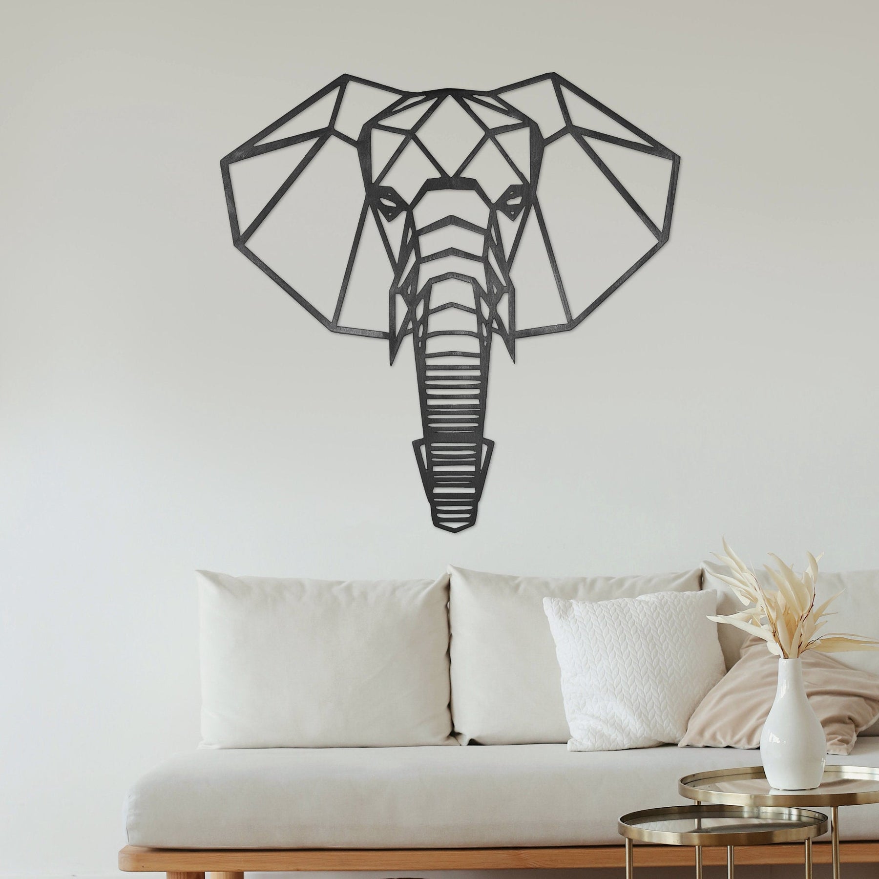 Laser cut elephant metal wall decor mounted in a living room
