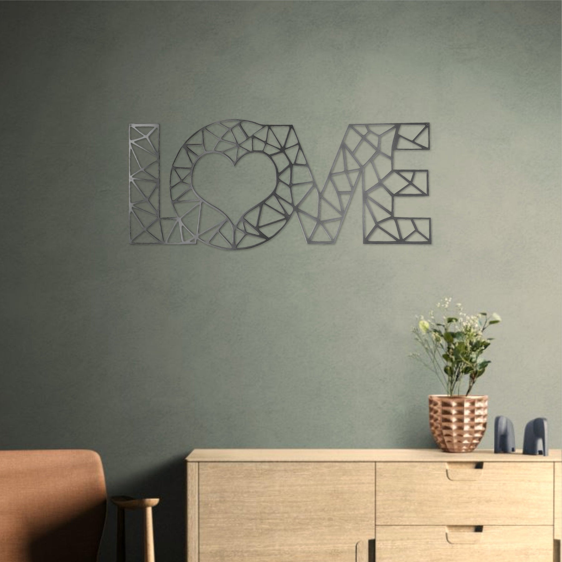 LOVE metal wall decor mounted on a green wall