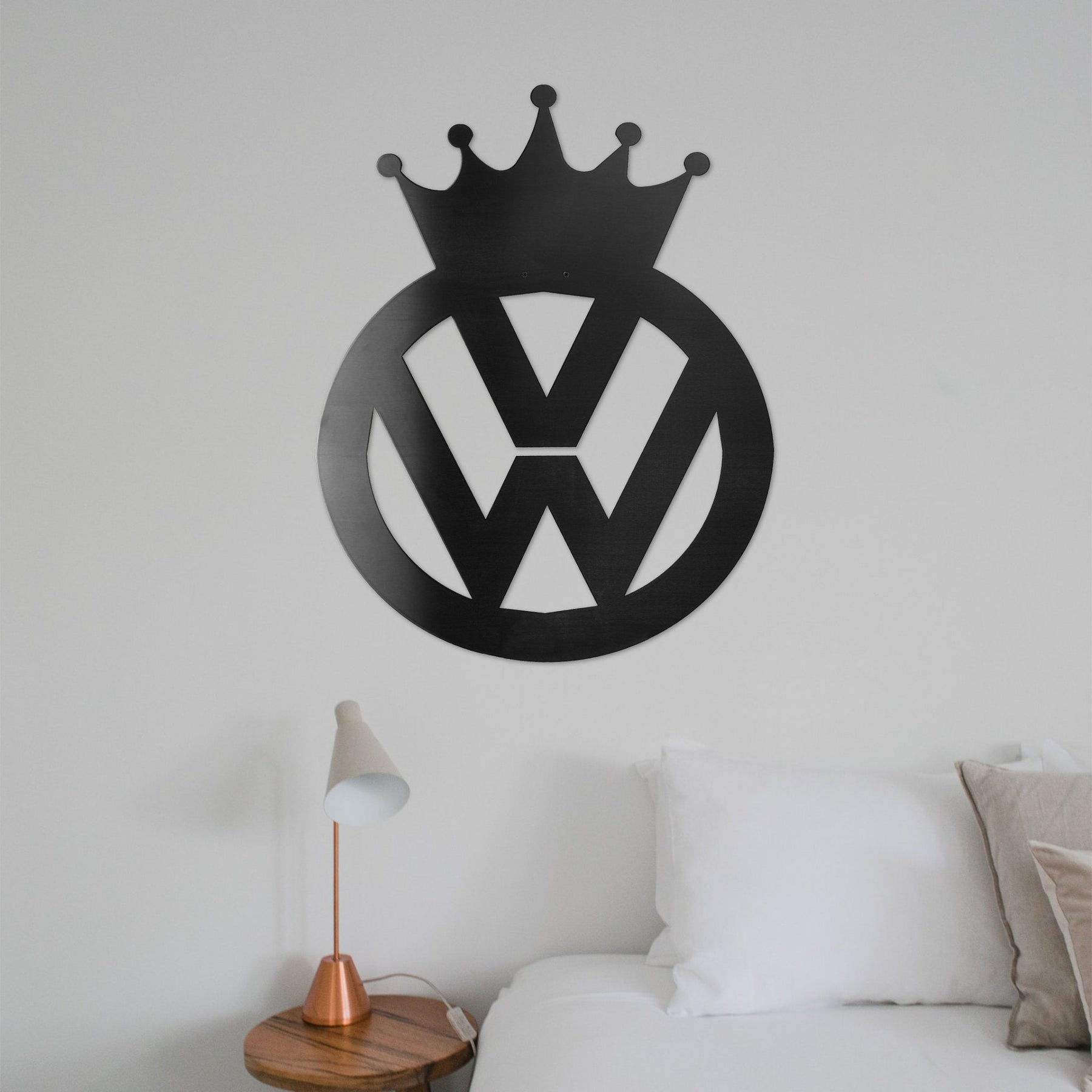 Volkswagen crest metal wall art on a bedroom wall